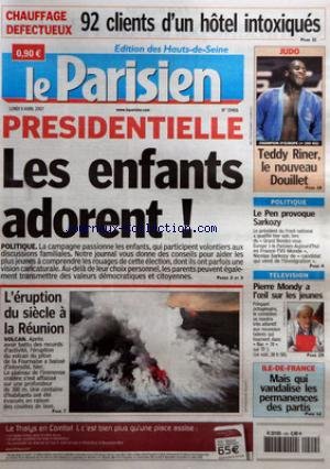 Free PARISIEN (LE) [No 19466] du 09/04/2007 - CHAUFFAGE DEFECTUEUX - 92 CLIENTS D'UN HOTEL INTOXIQUES JUDO - TEDDY RINER, LE NOUVEAU DOUILLET PRESIDENTIELLE - LES ENFANTS ADORENT ! - POLITIQUE L'ERUPTION DU SIECLE A LA REUNION - VOLCAN POLITIQUE - LE PEN PROVOQUE SARKOZY TELEVISION - PIERRE MONDY A L'OEIL SUR LES JEUNES ILE-DE-FRANCE - MAIS QUI VANDALISE LES PERMANENCES DES PARTIS. PDF Download